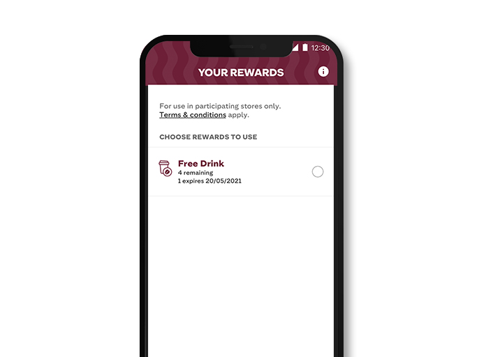2. Tap the 'Free drink' reward and then 'Use now'. You can redeem your free drinks at once or save them for later – you'll have up to 6 months to decide.
